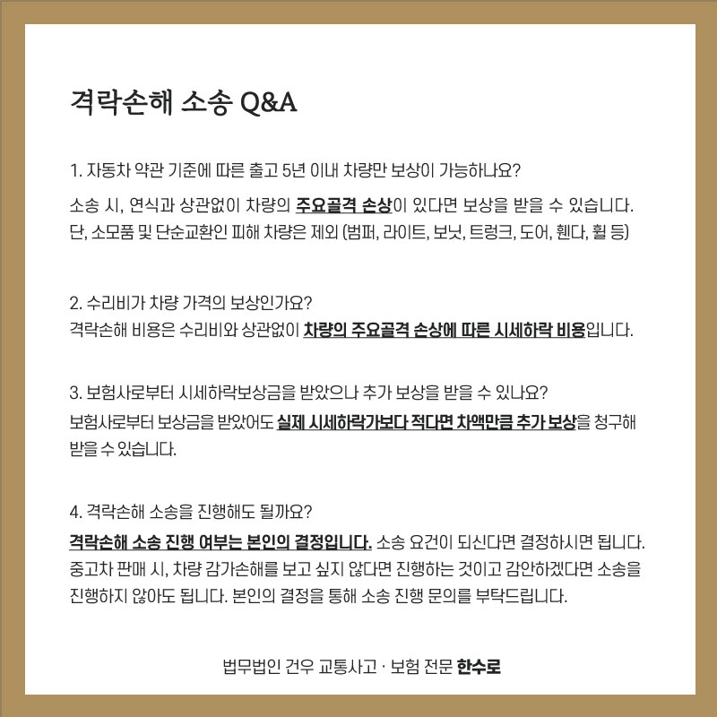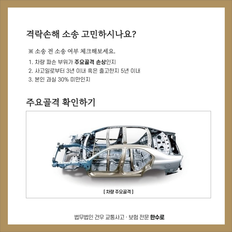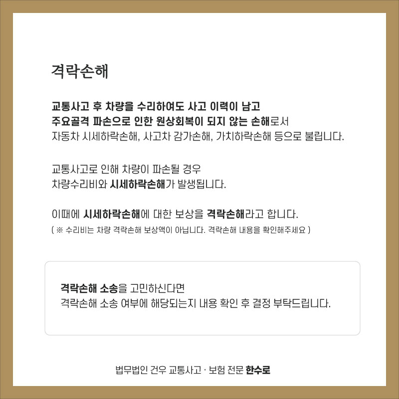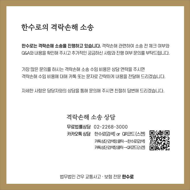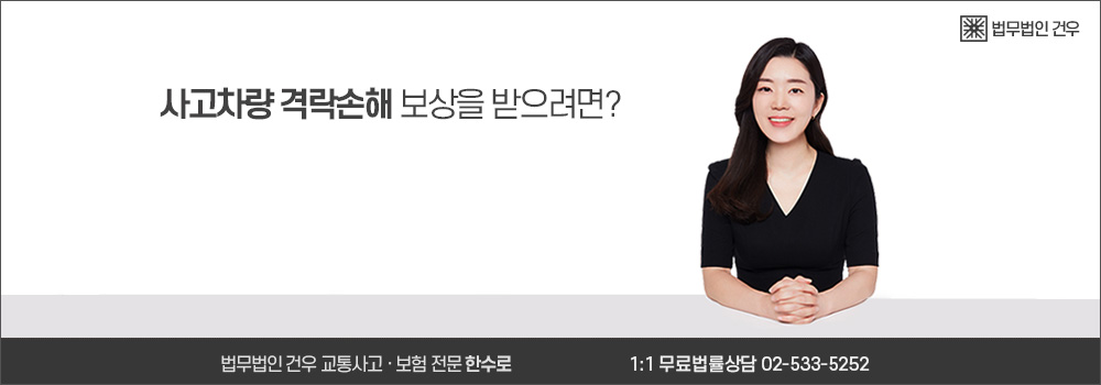 법무법인 건우의 한수로는 교통사고 · 보험 전문으로 격락손해 소송을 진행하고 있습니다. 보험사 약관 기준에 따른 격락손해 보상이 이루어지지 않는다면 소송을 통해 보상을 받을 수 있습니다. 궁금한 사항은 직접 한수로 전문가와의 상담을 통해 문의해주세요.