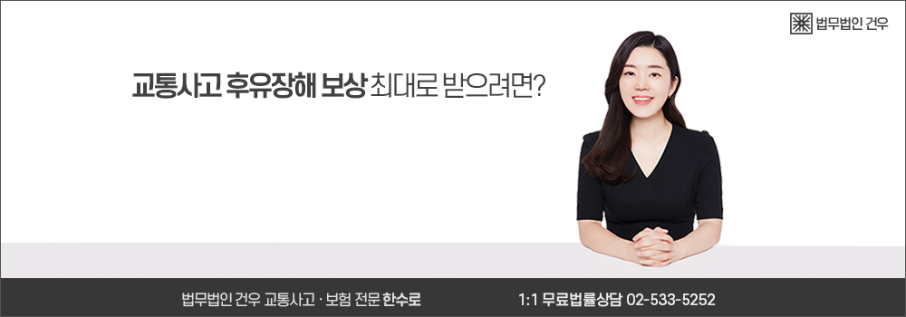 갑자기 발생한 교통사고로 인해 평범했던 일상으로 다시는 돌아갈 수 없는 상황이 되어 버렸을 수 있습니다. 그러나 앞으로의 삶도 중요하기에 법무법인 건우의 한수로는 의뢰인의 상황에 맞는 최대 보상을 이루기 위해 최선을 다해 사건에 임하고 있습니다. 합리적인 보상을 이루지 못해 억울한 상황이시라면 한수로 전문가와의 1:1 무료법률상담을 통해 명쾌한 해결책을 찾아보시기를 바랍니다.